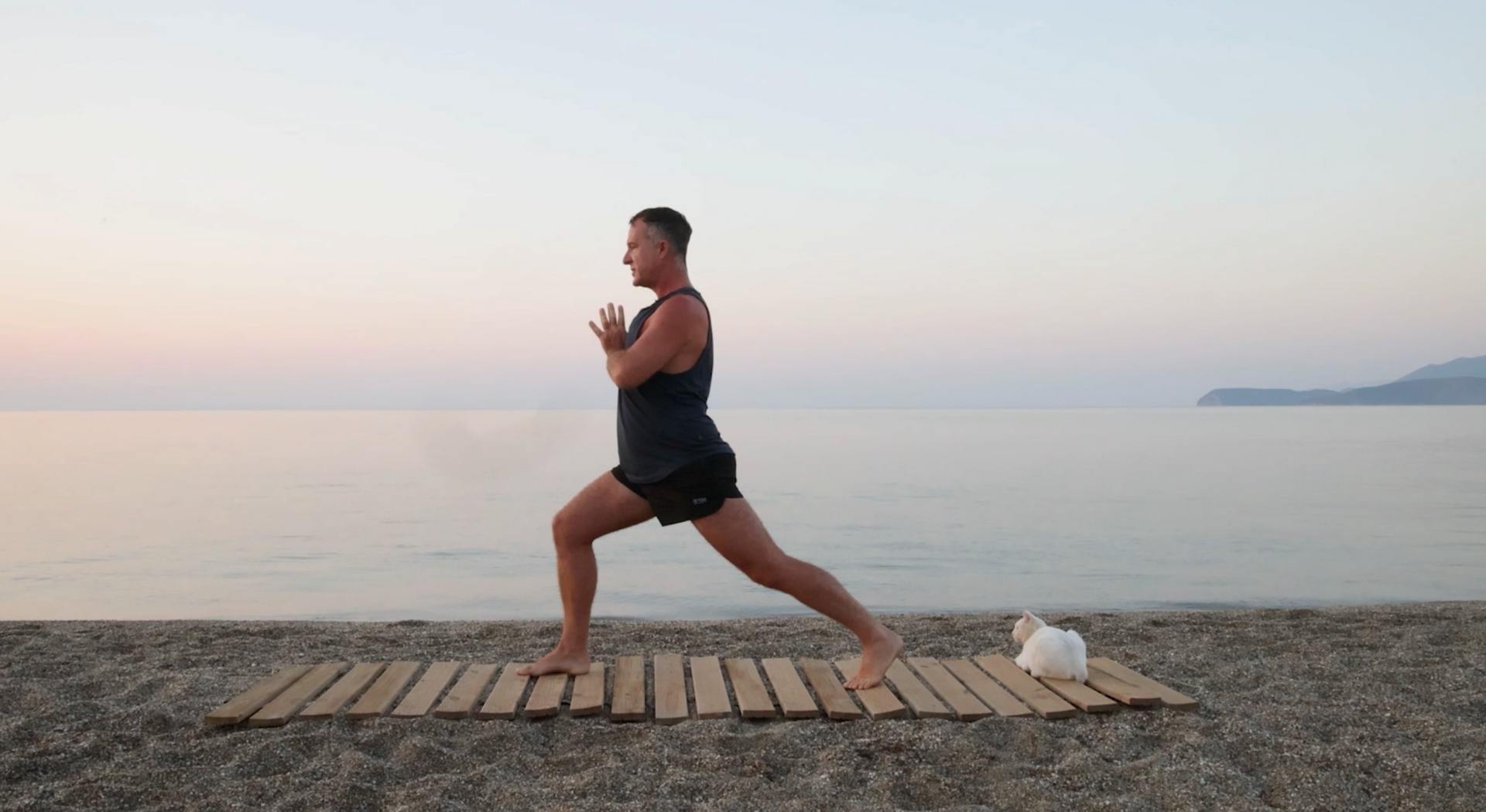 yoga for energy with yogi aaron greece beach 4 high lunge pose
