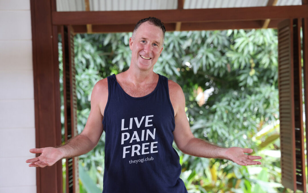 Yogi Aaron Bio Pic – live pain free | yogi aaron (a man) smiling with arms out in a gesture of receiving wearing a teacher that says live pain free